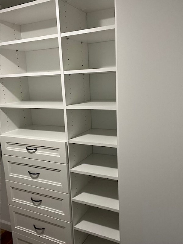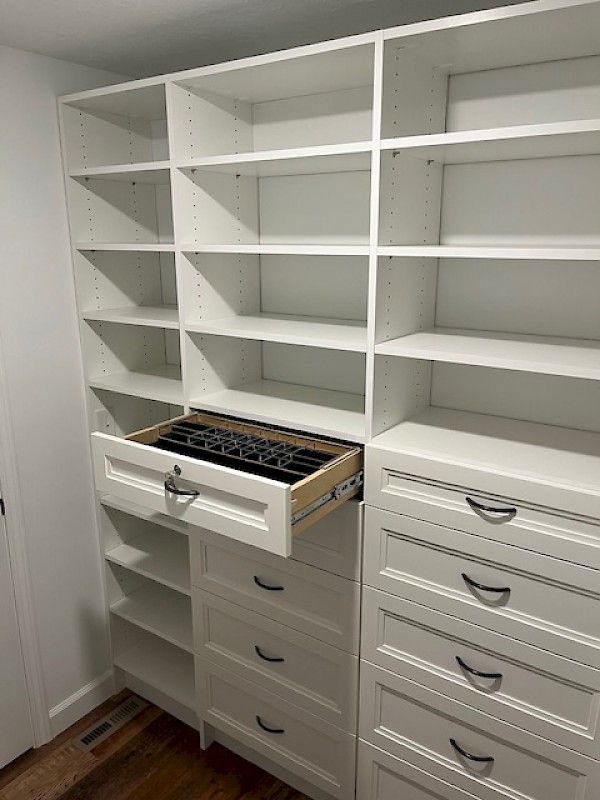 Walk-in closet system with white finish, Allegra drawer fronts, and a jewelry drawer with lock.