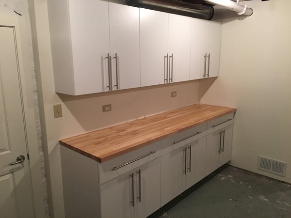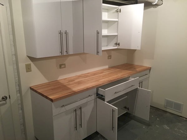 White cabinets with maple butcher block top with plenty of drawers and storage shelves.
