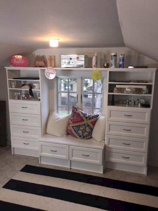 Bonus room with sloped ceiling. White, Milan drawer fronts, bench top under window. Installed in Lafayette, IN.