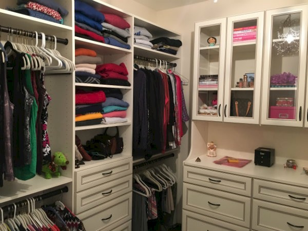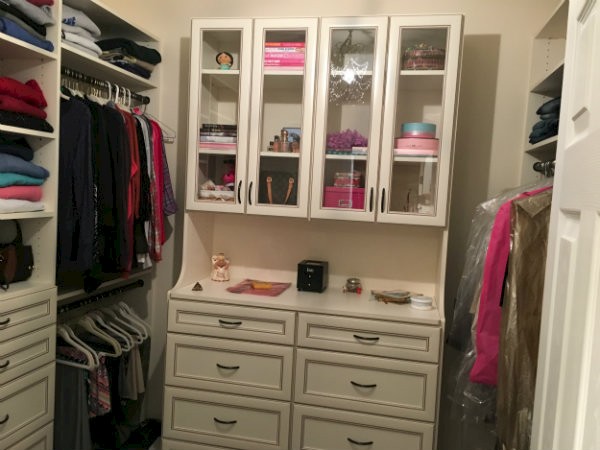 Walk-In Closet with double hutch unit, drawer/shelf tower, shoe tower and double/long hang.