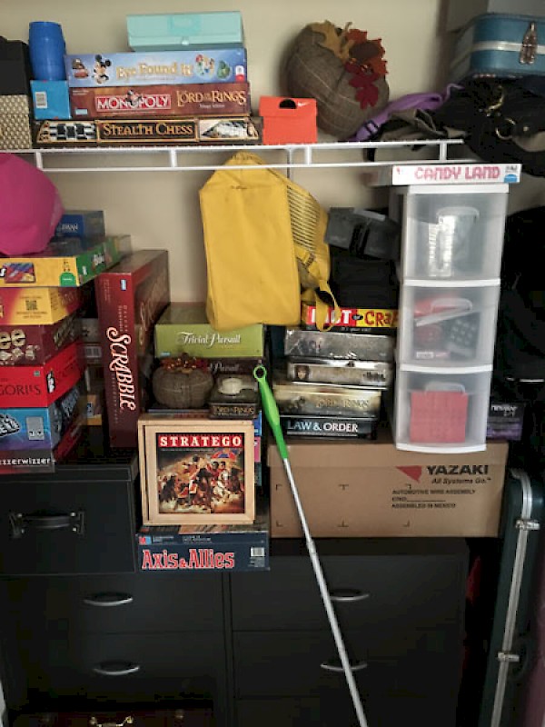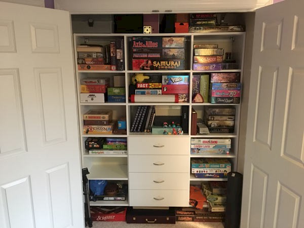 Look at this game closet organization compared to what it originally looked like before Organized Options designed and installed new closet shelving and drawer unit.