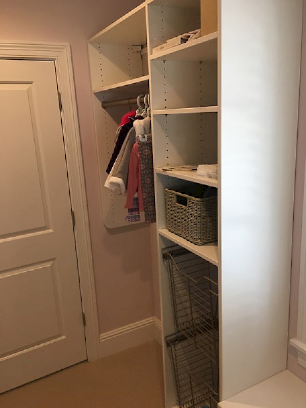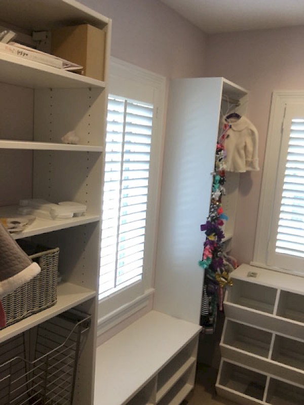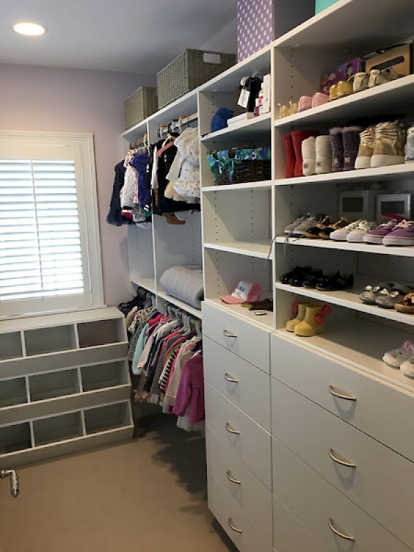 This girl's room has plenty of drawer and hanging space along pull out baskets and a window seating area.