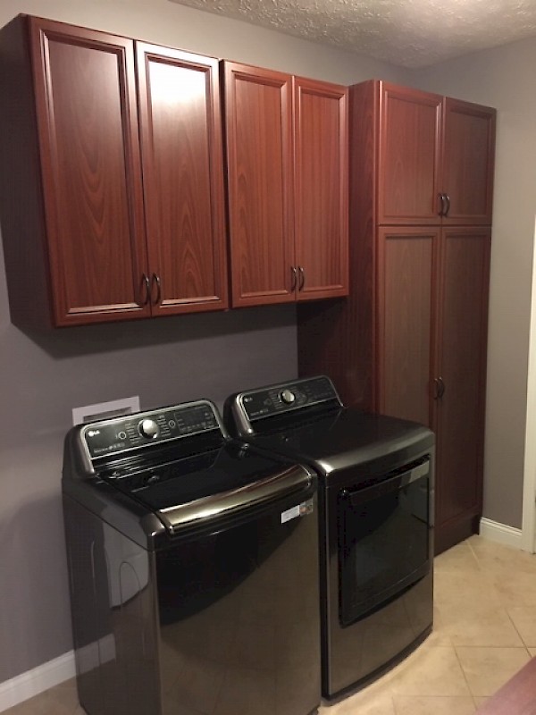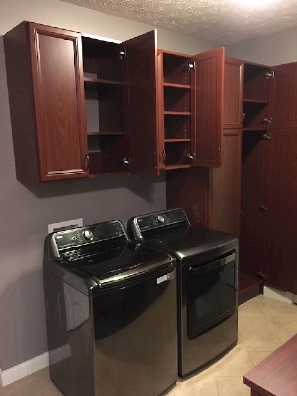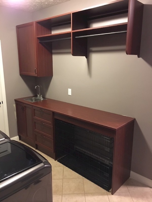 Client had a special request for a dog cage to be part of the cabinets which we were able to customize and locate under the counter where they wanted it. Above the counter they have hanging rods for clothes out of dryer along with a wash up sink. Beside the washer/dryer side is a tall cabinet for vacuum, mop, etc and above they have plenty of storage for detergent, cleaning supplies, etc