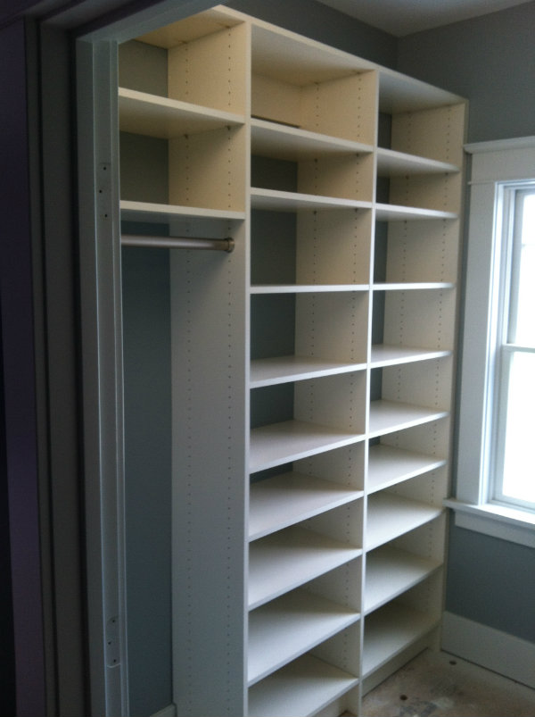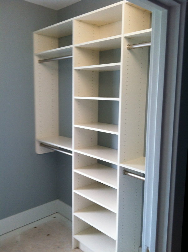 Walk in closet with double hang sections and shelf tower on one side of closet. Other side of closet has long hang and two shelf towers.