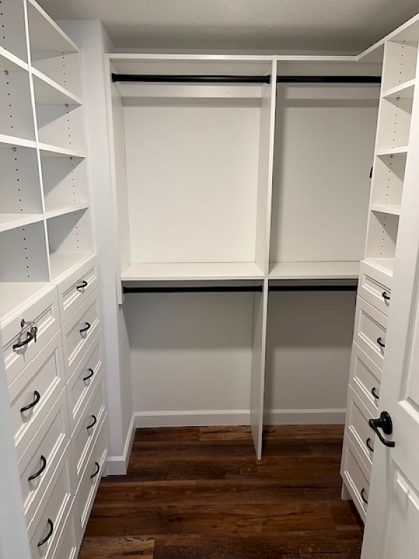 Walk-in closet system with white finish, Allegra drawer fronts, and a jewelry drawer with lock.