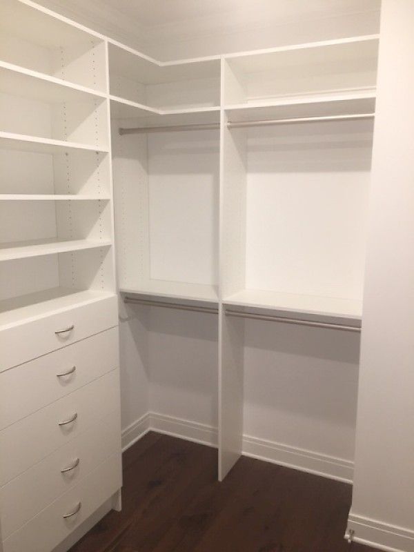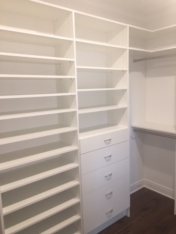 Walk in closet with drawers, shoe tower and upper storage