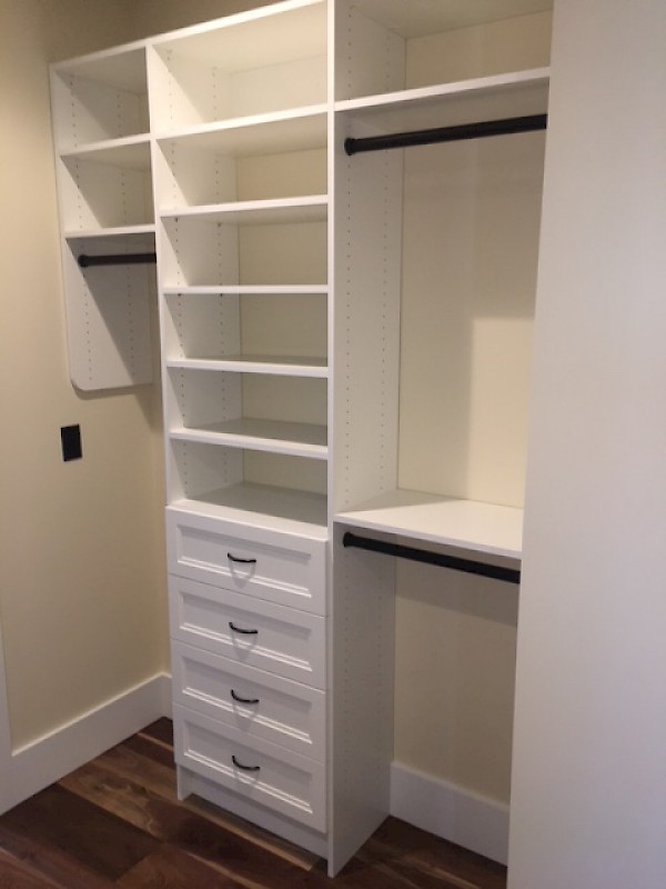 Custom walk-in closet system with oil-rubbed bronze hardware and accessories.