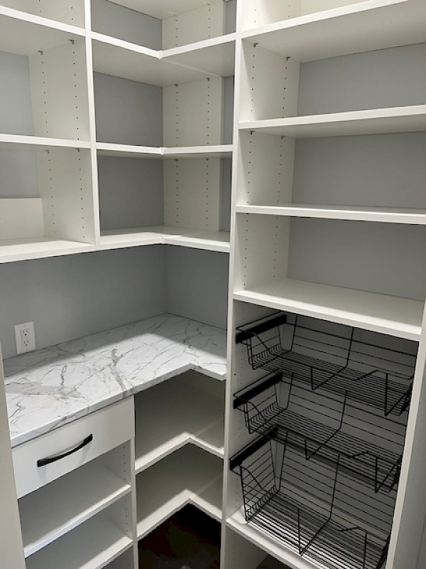 Counter top area for small appliances, pull out drawer for utensils, wire baskets, upper and lower storage areas.