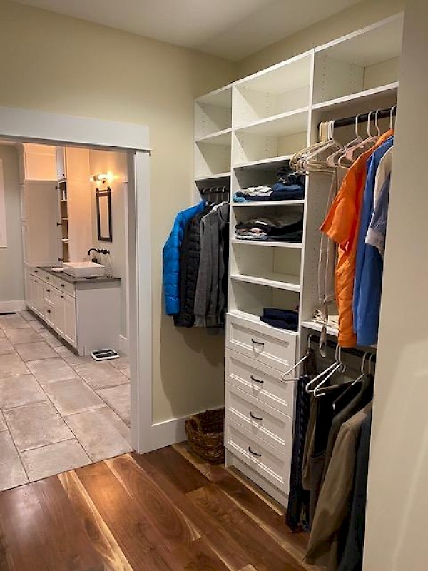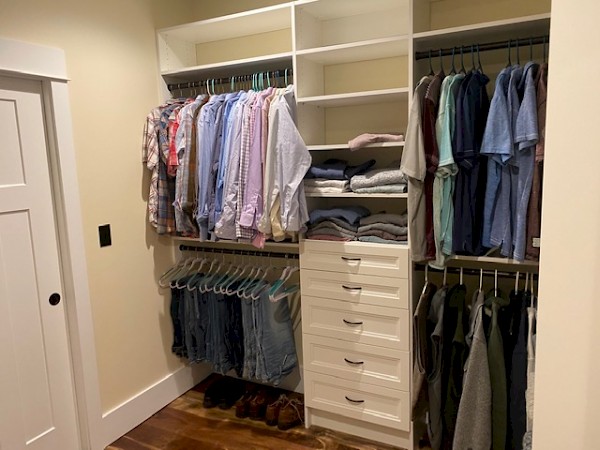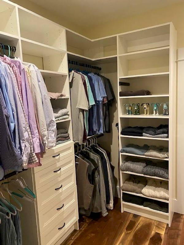 Master walk in closet system with white finish and oil rubbed bronze hardware installed in Lafayette, IN.